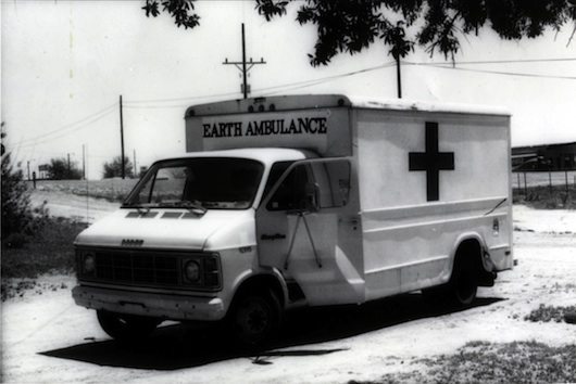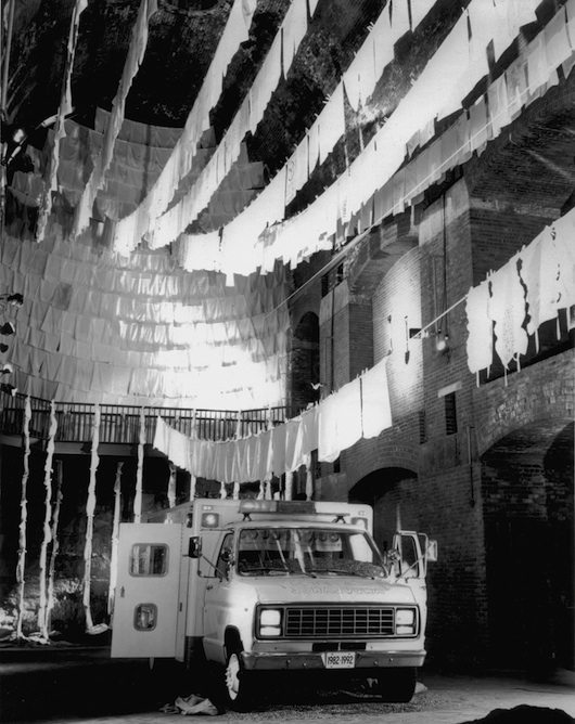 Earth Ambulance brought earth from 12 U.S. military sites to the United Nations on May 2, 1982. From the Livermore Weapons Lab in the West to the Piccatiny Warhead Design Arsenal in New Jersey. “America, Open your Windows! There are arsenals in your backyards!” From across the country folks scrawled their dreams and nightmares on pillow cases filled with earth from each site. Once emptied into frames as earth paintings, the pillow cases hung on clothes lines across Dag Hammerskjold Plaza between 1st and 2nd Avenues. Performance Art in action before the Mass Rally for Disarmament June 12, 1982.